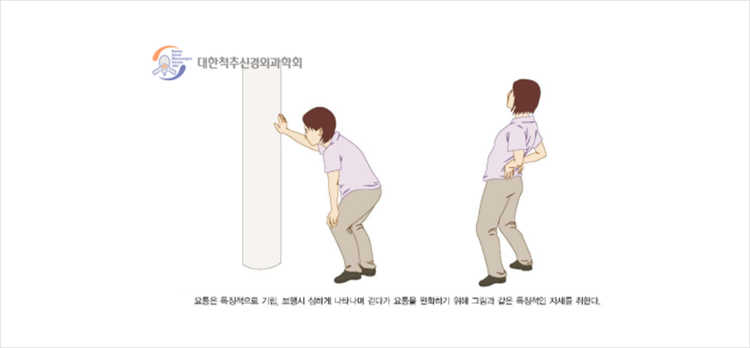 똑바로 선 자세로 오래 서있기 힘들며, 보행을 할수록 허리가 더 굽어지면서 땅을 보게 되고 지팡이 등의 보조기구가 없을 경우 앞을 보기 힘들거나 걷기 힘든 경우가 많습니다. 허리의 통증이나 다리의 통증이 같이 동반되는 경우도 많고 특징적으로 보행 시 증상이 심해져서 통증을 완화하고 몸이 앞으로 굽어지는 것을 이겨내기 위해 가슴을 내밀고 어깨를 뒤로 젖히는 특징적인 자세를 취합니다.