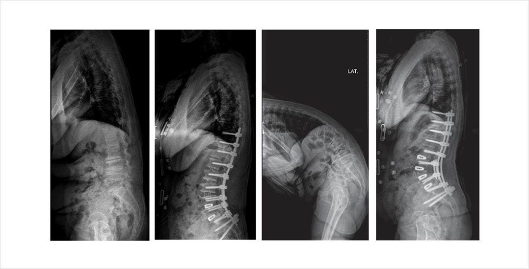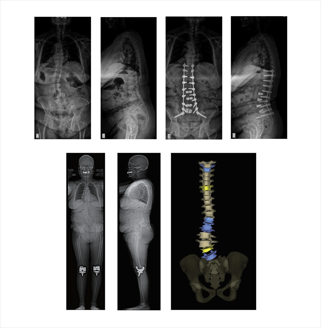 전신 척추 전후면 및 측면 영상(Whole spine AP and Lateral X ray)을 통해 척추의 균형 상태를 파악해야 합니다.