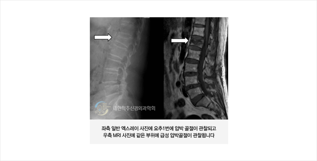 골다공증이 있는 환자에서 외상 후 (일부에서는 다친 것을 기억하지 못하는 경우도 있습니다)에 1-2 주 정도 후에도 국소적인 척추 통증이 지속될 때 의심할 수 있습니다. 대개의 경우 하지로 통증이 내려오지는 않으며 흉곽이나 복부 쪽에 통증이 같이 동반될 수 있습니다.